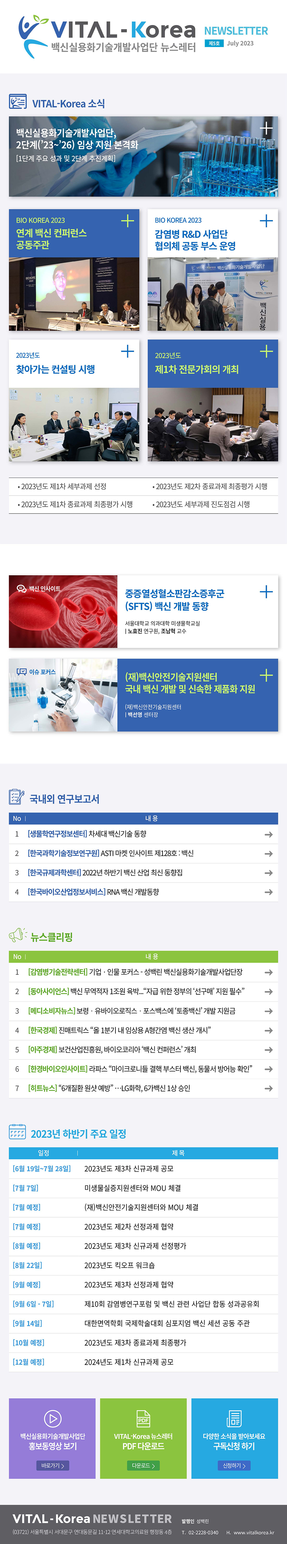 백신실용화기술개발사업단, 2단계(’23~’26) 임상 지원 본격화 BIO KOREA 2023 연계 백신 컨퍼런스 공동주관 BIO KOREA 2023 감염병 R&D 사업단 협의체 공동 부스 운영 2023년도 찾아가는 컨설팅 시행 2023년도 제1차 전문가회의 개최 2023년도 제1차 세부과제 선정 2023년도 제1차 종료과제 최종평가 시행 2023년도 제2차 종료과제 최종평가 시행 2023년도 세부과제 진도점검 시행 [생물학연구정보센터] 차세대 백신기술 동향 [한국과학기술정보연구원] ASTI 마켓 인사이트 제128호 : 백신 [한국규제과학센터] 2022년 하반기 백신 산업 최신 동향집 [한국바이오산업정보서비스] RNA 백신 개발동향 [감염병기술전략센터] 기업·인물 포커스 - 성백린 백신실용화기술개발사업단장 [동아사이언스] 백신 무역적자 1조원 육박..."자급 위한 정부의 '선구매' 지원 필수" [메디소비자뉴스] 보령 유바이오로직스 포스백스에 ‘토종백신’ 개발지원금 [한국경제] 진매트릭스 "올 1분기 내 임상용 A형간염 백신 생산 개시" [아주경제] 보건산업진흥원, 바이오코리아 ‘백신 컨퍼런스’ 개최 [한경바이오인사이트] 라파스 "마이크로니들 결핵 부스터 백신, 동물서 방어능 확인" [히트뉴스] "6개질환 원샷 예방"…LG화학, 6가백신 1상 승인 2023년도 제3차 신규과제 공모 대한면역학회 국제학술대회 심포지엄 백신 세션 공동 주관 뉴스레터 메인 뉴스레터 메인 02-2228-0340 https://www.vitalkorea.kr 홍보동영상 보기 구독신청하기 중증열성혈소판감소증후군(SFTS) 백신 개발 동향 (재)백신안전기술지원센터 국내 백신 개발 및 신속한 제품화 지원 PDF 다운로드