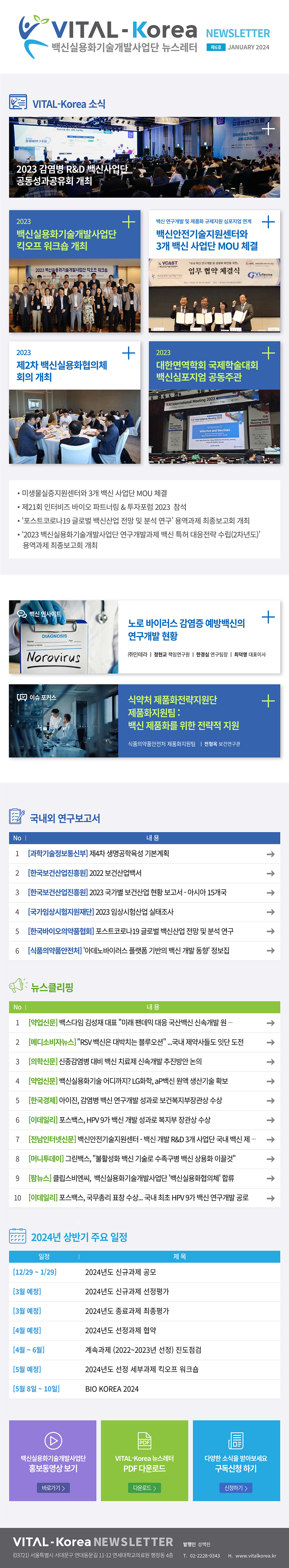 2023 감염병 R&D 백신사업단 공동성과공유회 개최 2023 백신실용화기술개발사업단 킥오프 워크숍 개최 백신 연구개발 및 제품화 규제지원 심포지엄 연계 백신안전기술지원센터와 3개 백신 사업단 MOU 체결 2023년도 제2차 백신실용화협의체 회의 개최 '2023 대한면역학회 국제학술대회' 백신 심포지엄 공동주관 미생물실증지원센터와 3개 백신 사업단 MOU 체결 제21회 인터비즈 바이오 파트너링 & 투자포럼 2023 참석 「포스트코로나19 글로벌백신산업 전망 및 분석연구」 용역과제 최종보고회 개최 [과학기술정보통신부] 제4차 생명공학육성 기본계획 [한국보건산업진흥원] 2022 보건산업백서 [한국보건산업진흥원] 2023 국가별 보건산업 현황 보고서 - 아시아 15개국 [국가임상시험지원재단] 2023 임상시험 산업실태 조사 [한국바이오의약품협회] 포스트코로나19 글로벌 백신산업 전망 및 분석 연구 [식품의약품안전처] ‘아데노바이러스 플랫폼 기반의 백신 개발 동향‘ 정보집 [약업신문] [인터뷰] 백스다임 김성재 대표 "미래 팬데믹 대응 국산백신 신속개발 원천기술로 세계 시장 선점“ [메디소비자뉴스] “RSV 백신은 대박치는 블루오션”…국내제약사들도 잇단 도전 [의학신문] 신종감염병 대비 백신·치료제 신속개발 추진방안 논의 [약업신문] 백신실용화기술 어디까지? LG화학, aP백신 원액 생산기술 확보 [한국경제] 아이진, 감염병 백신 연구개발 성과로 보건복지부장관상 수상 [이데일리] 포스백스, HPV 9가 백신 개발 성과로 복지부 장관상 수상 [전남인터넷신문] 백신안전기술지원센터 - 백신 개발 R&D 3개 사업단 국내 백신 제품화를 위한 동행의 첫걸음 [머니투데이] 그린백스, "불활성화 백신 기술로 수족구병 백신 상용화 이끌 것" [팜뉴스] 클립스비엔씨, 백신실용화기술개발사업단 ‘백신실용화협의체’ 합류 [이데일리] 포스백스, 국무총리 표창 수상…국내 최초 HPV 9가 백신 연구개발 공로 [12/27~1/26] 2024년도 신규과제 공모 [5월 8일~10일] BIO KOREA 2024 노로바이러스 감염증 예방백신의 연구개발 현황 백신 제품화 규제 지원방안 2023 백신실용화기술개발사업단 연구개발과제 백신 특허 대응전략 수립 뉴스레터 메인 홍보동영상 보기 PDF 다운로드 구독신청하기 02-2228-0340 https://www.vitalkorea.kr/kr/