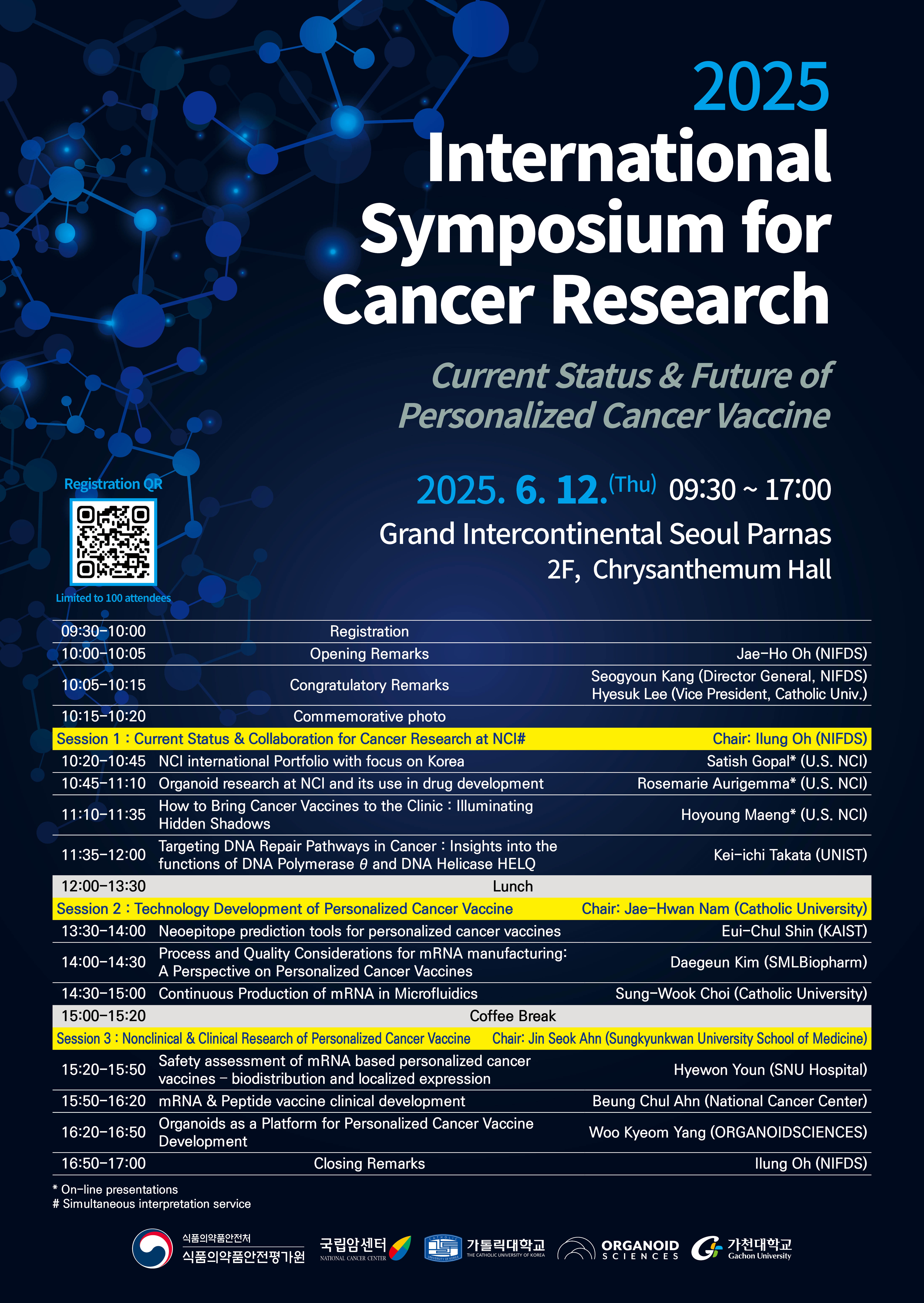 | 제목 | [유관기관 공지] 식품의약품안전평가원 International Symposium for Cancer Research 개최 안내(6/12(목) 09:30) |