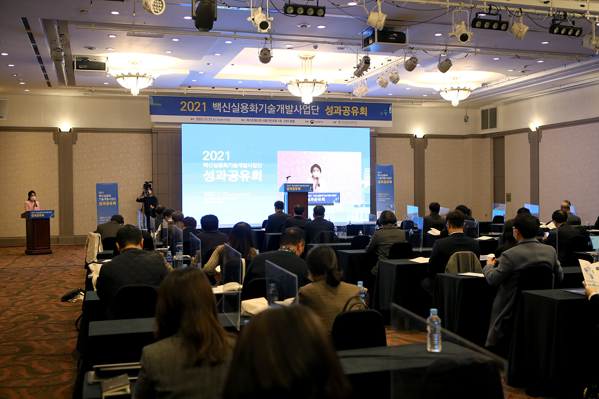 「2021 백신실용화기술개발사업단 성과공유회」가 보건복지부 주최, 백신실용화기술개발사업단 주관으로 2021년 11월 17일(수) 베스트웨스턴 서울가든호텔에서 온‧오프라인 동시 개최됐다. 이번 성과공유회는 백신실용화기술개발사업단 지원과제의 우수성과 상용화 촉진과 연구자간 파트너링 기회를 제공하기 위해 기획됐으며, 주제발표와 우수성과 발표, 질의응답 등으로 진행됐다.